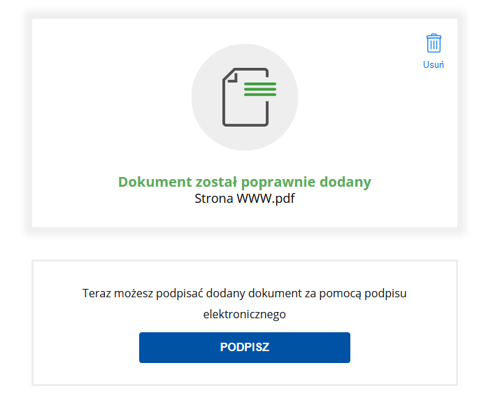 3. Jeśli dokument zaczyta się poprawnie, wyświetli się odpowiedni komunikat. Następnie należy kliknąć “Podpisz”: