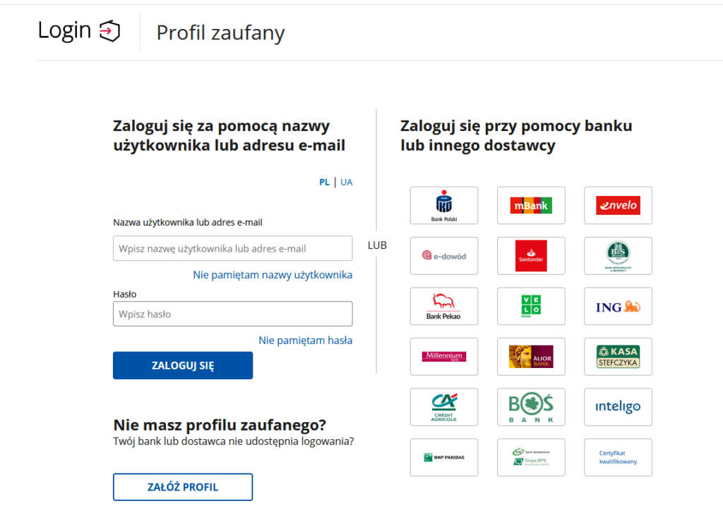 4. Przycisk przekierował Cie na stronę logowania do profilu zaufanego. Możesz tutaj zalogować się za pomocą profilu, przy pomocy banku lub za pomocą innego dostawcy: