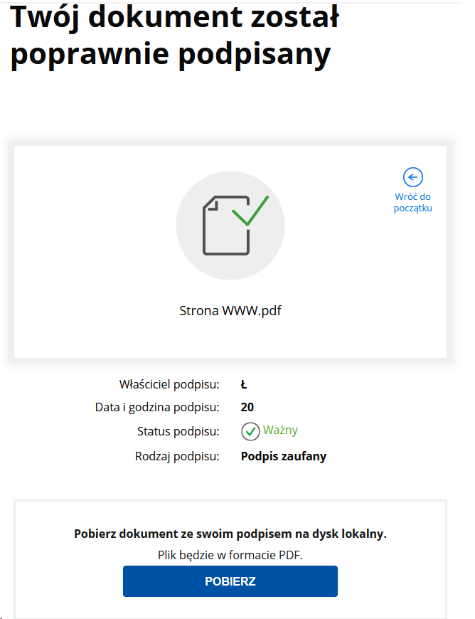 8. Twój dokument jest poprawnie podpisany, gdy w polu “Status podpisu” widzisz zielony znacznik “Ważny”. Poniżej znajduje się przycisk “Pobierz”: