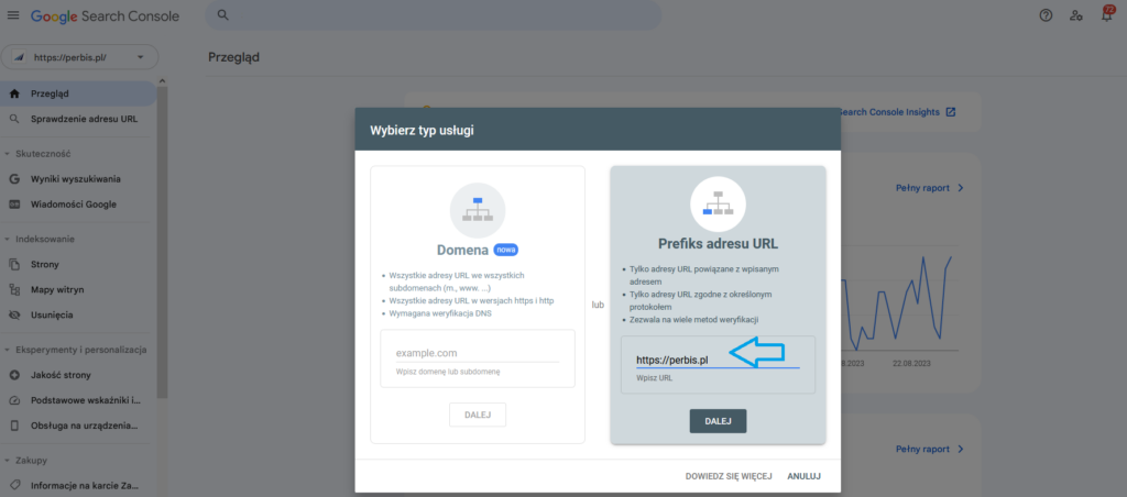 Teraz można dodać usługę przez prefiks adresu URL. Adres należy wpisać z wersją “https” na początku (nie “http”) oraz bez “www”. Następnie klikamy “Dalej”.