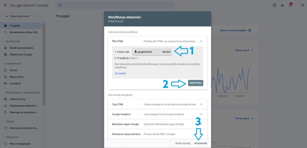 Następnie pojawi się okienko, w którym wybieramy metody weryfikacji. Jest ich kilka, ale skupimy się na najpopularniejszej, czyli wgraniu pliku na serwer.