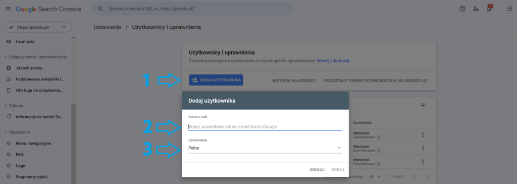 Następnie należy kliknąć “Dodaj użytkownika” [1] oraz uzupełnić adres e-mail [2] oraz nadać uprawnienia “Pełne” [3].