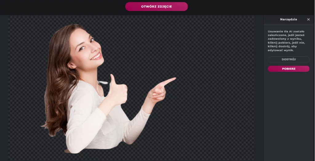 Do tego celu możesz wykorzystać Pixlr. Po przejściu na stronę kliknij przycisk „Otwórz zdjęcie” i wybierz obraz, który chcesz zmodyfikować. Tło zostanie usunięte automatycznie.
