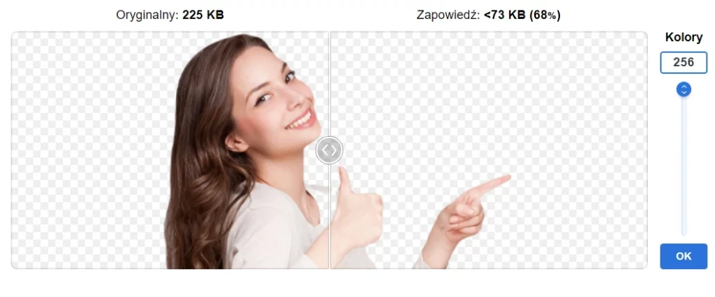 Na powyższym przykładzie waga zdjęcia uległa zmniejszeniu z 225 KB na 73 KB. Warto jednak zoptymalizować zdjęcie ręcznie, używając suwaka znajdującego się po prawej stronie. Obniżając jakość pliku, możesz jeszcze bardziej zmniejszyć jego wagę. Pamiętaj jednak, aby zachować umiar. Bezpieczną praktyką jest pozostawienie minimum 80-procentowej jakości.