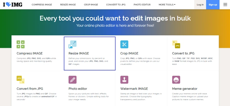 Zmienić rozmiar zdjęcia, a także przyciąć grafiki i dokonać konwersji plików możesz również w I Love IMG. Wejdź na stronę www.iloveimg.com i wybierz opcję „Resize Image”.