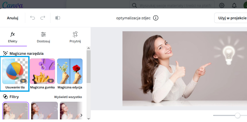 Wgraj zdjęcie i kliknij “Edytuj obraz”. Na koniec wybierz “Usuwanie tła” dostępne w sekcji “Magiczne narzędzia”: